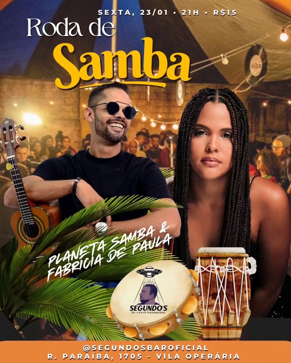 Foto: Divulgação Já no Segundo’s Bar, na Rua Paraíba, no bairro Vila Operária, ocorre uma roda de samba com Planeta Samba e Fabrícia de Paula, a partir das 21h. O acesso custa R$ 15.