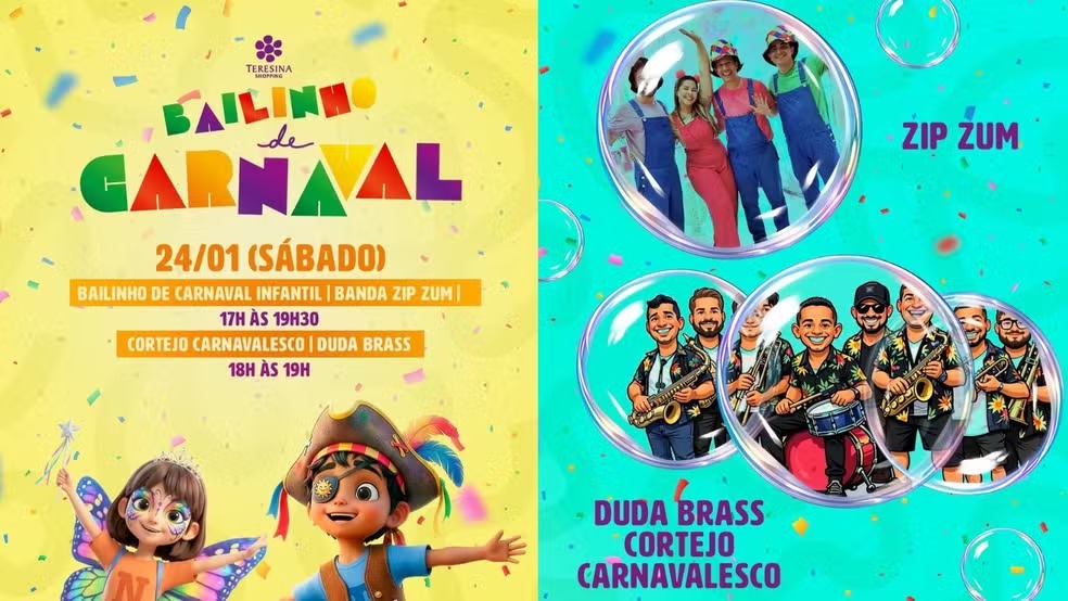 A programação de sábado começa voltada para o público infantil. A partir das 17h, o Teresina Shopping promove o Bailinho de Carnaval Infantil, com entrada gratuita. Em seguida, às 18h, o local recebe o Cortejo Carnavalesco da Duda Brass, também gratuito.