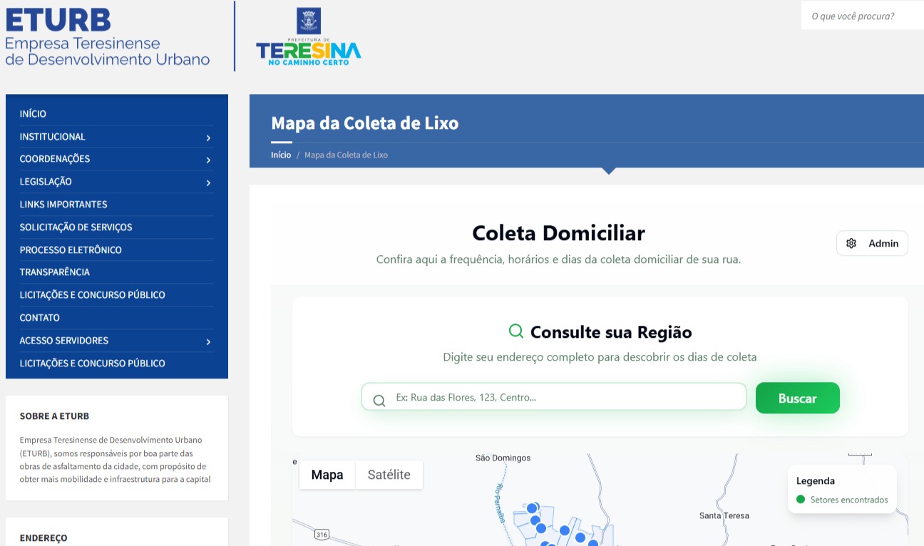 A nova plataforma da Eturb permite que os cidadãos consultem, pelo site https://eturb.pmt.pi.gov.br/mapa-da-coleta-de-lixo/, os dias da semana e horários em que a coleta domiciliar passa em cada endereço. Basta digitar o endereço completo no campo de busca e clicar em “Buscar”. O sistema identifica automaticamente o setor de coleta e exibe as informações específicas da região, incluindo a empresa responsável pelo serviço.
