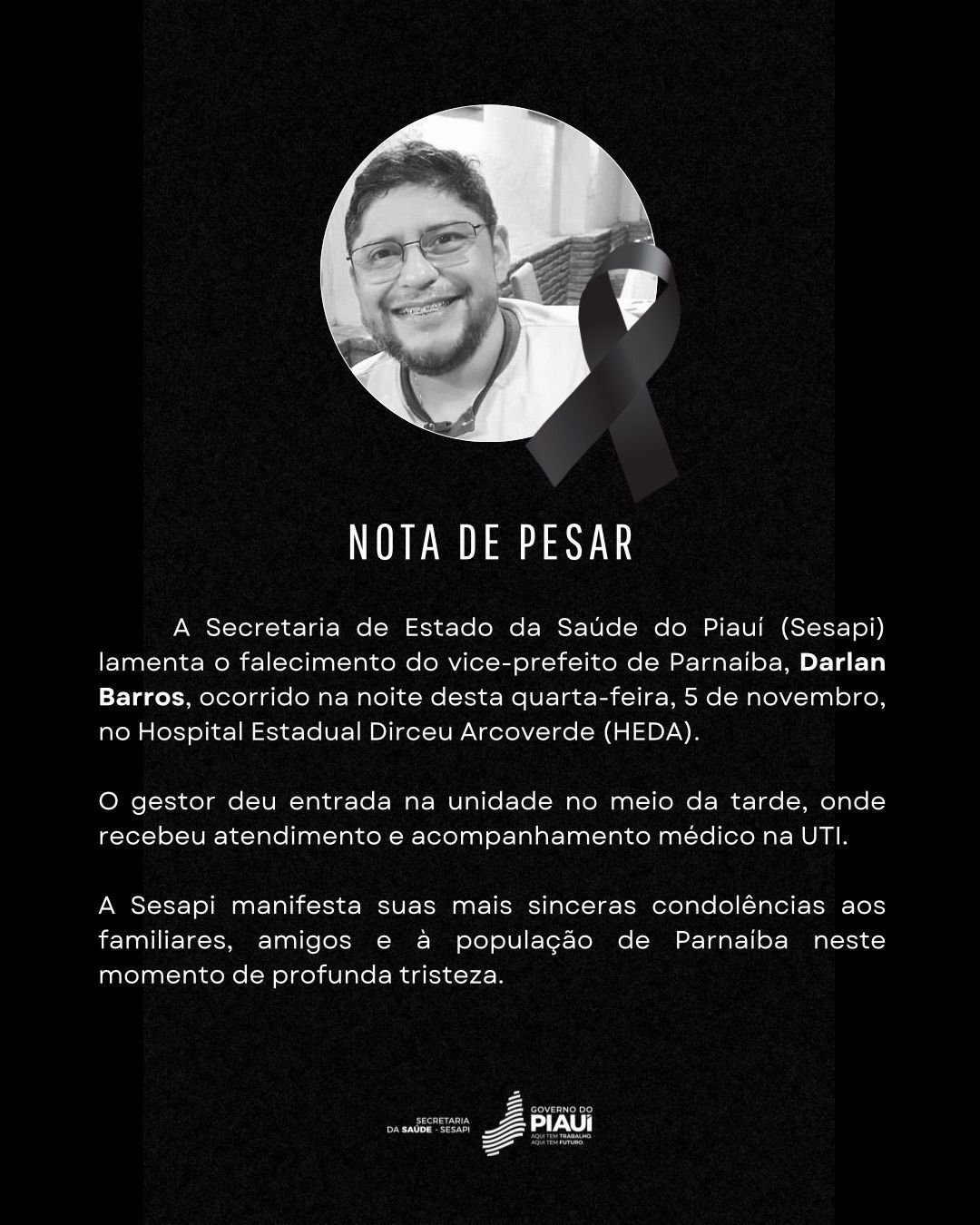 O vice-prefeito de Parnaíba, Darllan Barros (PP), de 47 anos, faleceu na noite desta quarta-feira (5), no Hospital Estadual Dirceu Arcoverde (Heda). O político, que também atuava como médico, estava internado na UTI da unidade de saúde, mas a causa da morte ainda não foi divulgada.