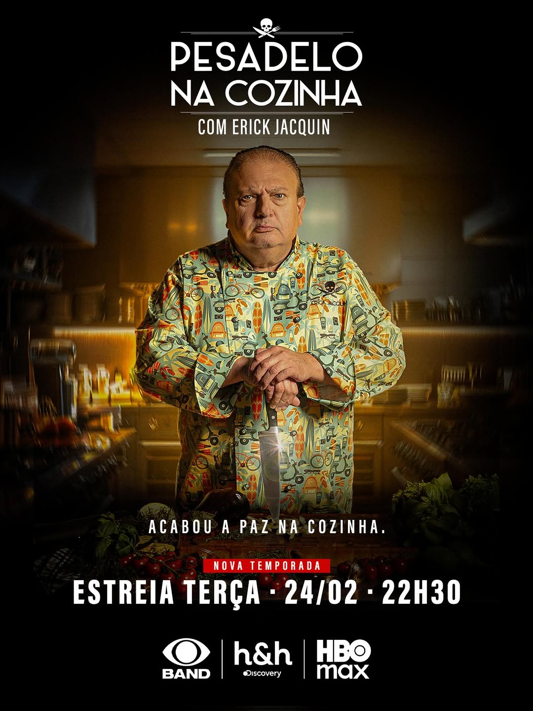 A nova temporada do Pesadelo na Cozinha, comandado pelo chef Erick Jacquin, já tem data para estrear. O programa chega às plataformas HBO Max e Discovery Home & Health no dia 20 de fevereiro e, quatro dias depois, passa a ser exibido na tela da Band, às 22h30.