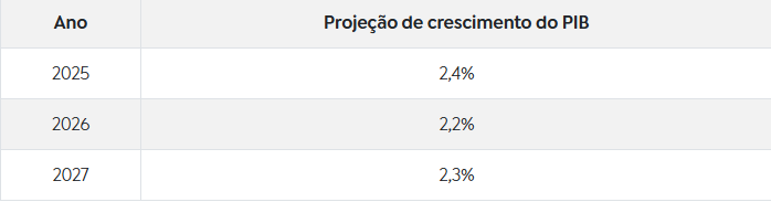 O Ministério da Fazenda tem projeções mais otimistas, com alta de 2,3% em 2025 e de 2,4% em 2026, de acordo com o Boletim MacroFiscal de setembro.