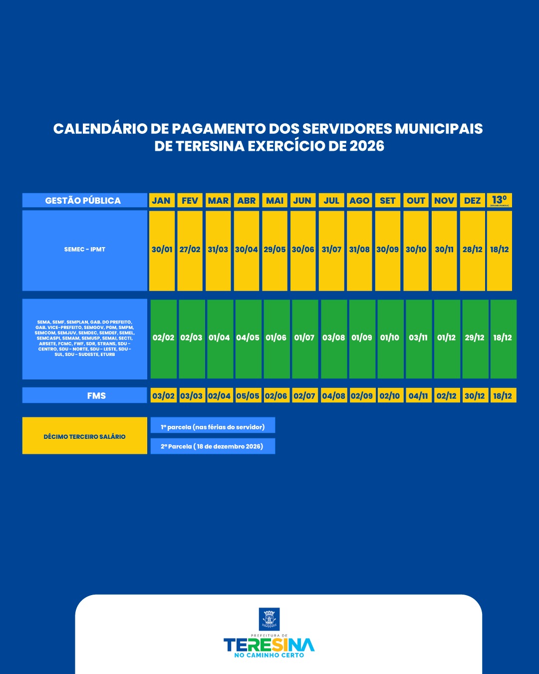 A Prefeitura de Teresina divulgou, nesta terça-feira (27), o calendário oficial de pagamento dos salários dos servidores municipais referente ao ano de 2026, detalhando as datas de repasse ao longo de todos os meses e o cronograma do décimo terceiro salário.