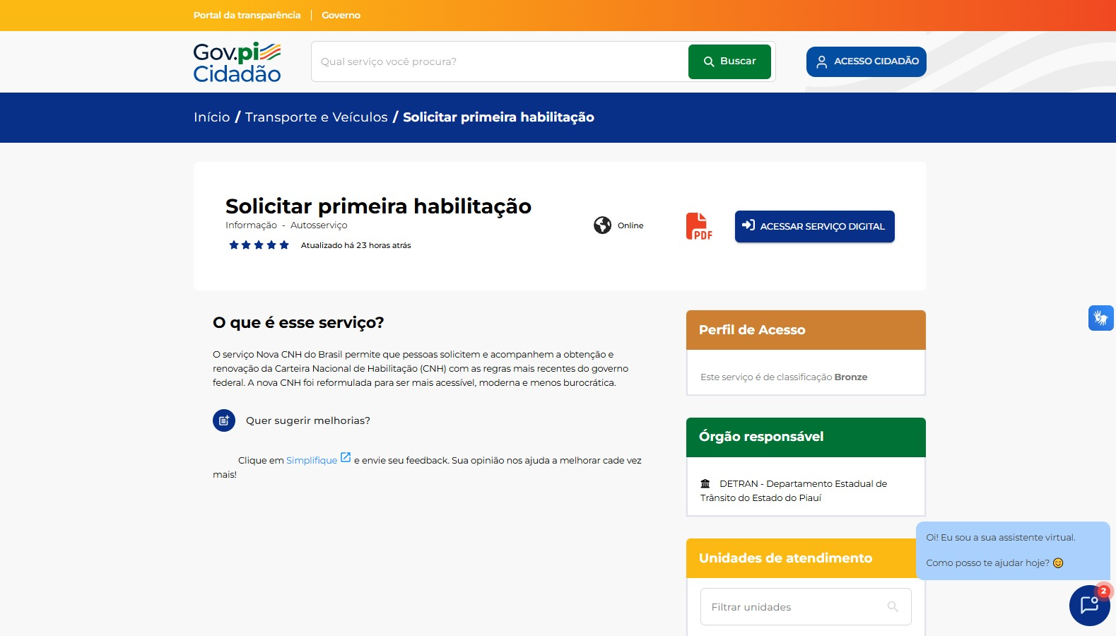 Os interessados podem acessar o serviço por meio do aplicativo Gov.pi Cidadão e a aba “1ª habilitação” está disponível para realizar o pré-cadastro. Além dessa possibilidade, o interessado pode utilizar o serviço pela página https://pidigital.pi.gov.br/ ou pelo App “CNH do Brasil”. Após esse passo inicial via digital, o processo segue com o curso teórico, coleta de biometria e exames.