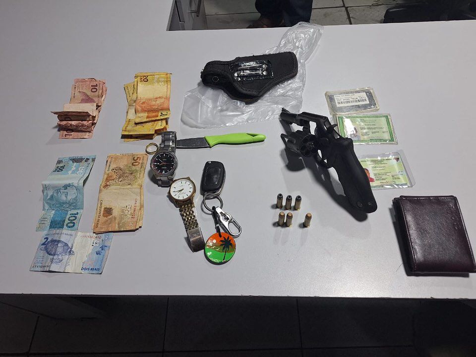 Foto: Divulgação A perseguição teve fim na Rua 12, no bairro Cohab, onde os suspeitos foram abordados. No local, os policiais apreenderam um revólver calibre .38 com seis munições intactas, R$ 702,00 em dinheiro e um carro modelo HB20 azul. Os três detidos, já conhecidos da polícia, foram levados à Central de Flagrantes para os procedimentos legais.