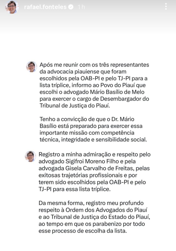 O governador Rafael Fonteles anunciou neste domingo (7), a nomeação do advogado Mário Basílio de Melo como novo desembargador do Tribunal de Justiça do Estado do Piauí (TJ-PI). A vaga é destinada à advocacia pelo Quinto Constitucional.